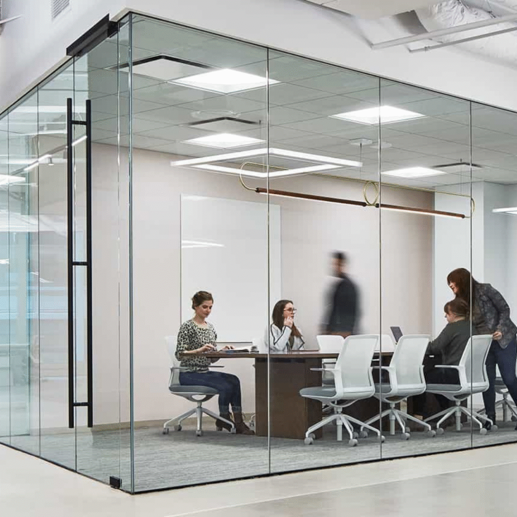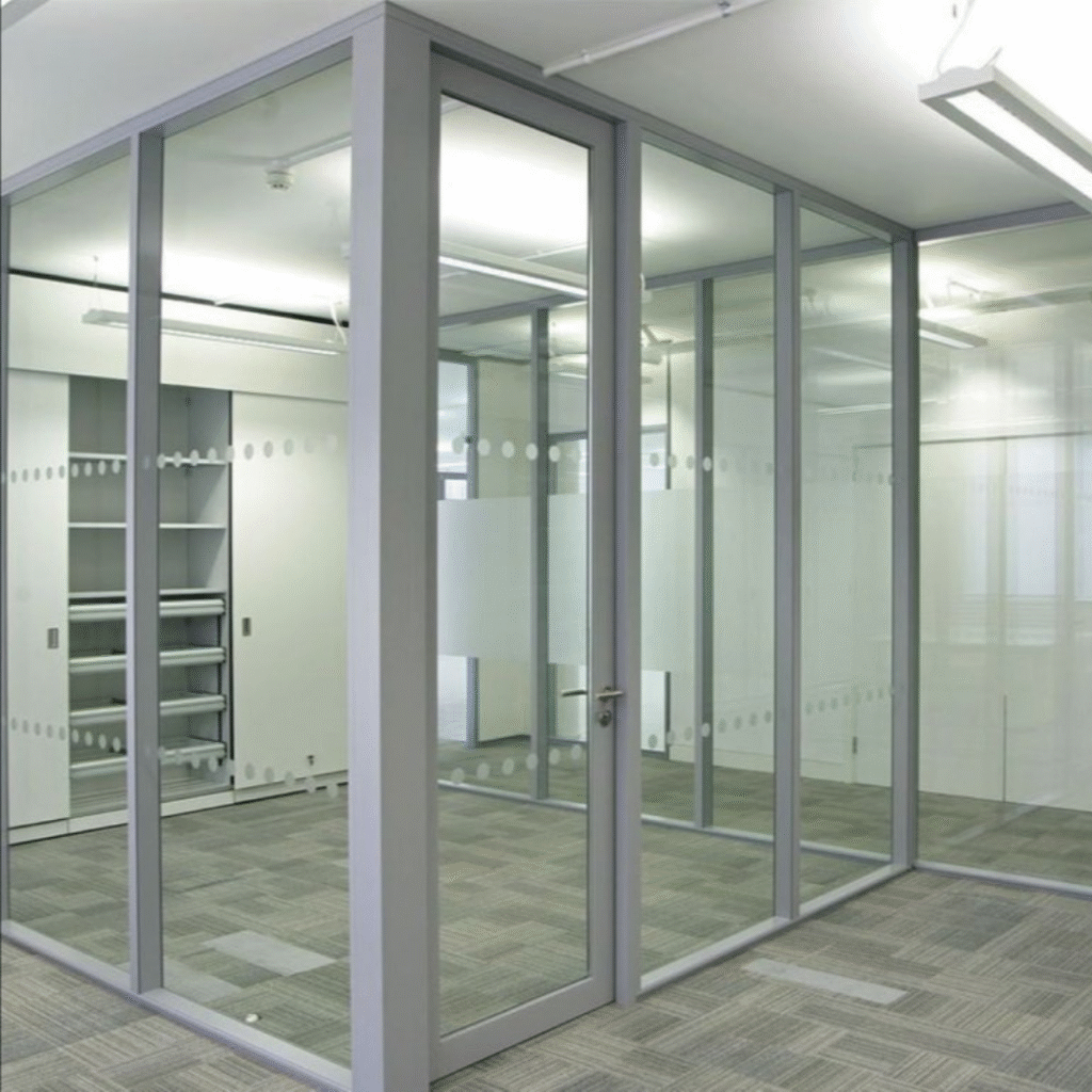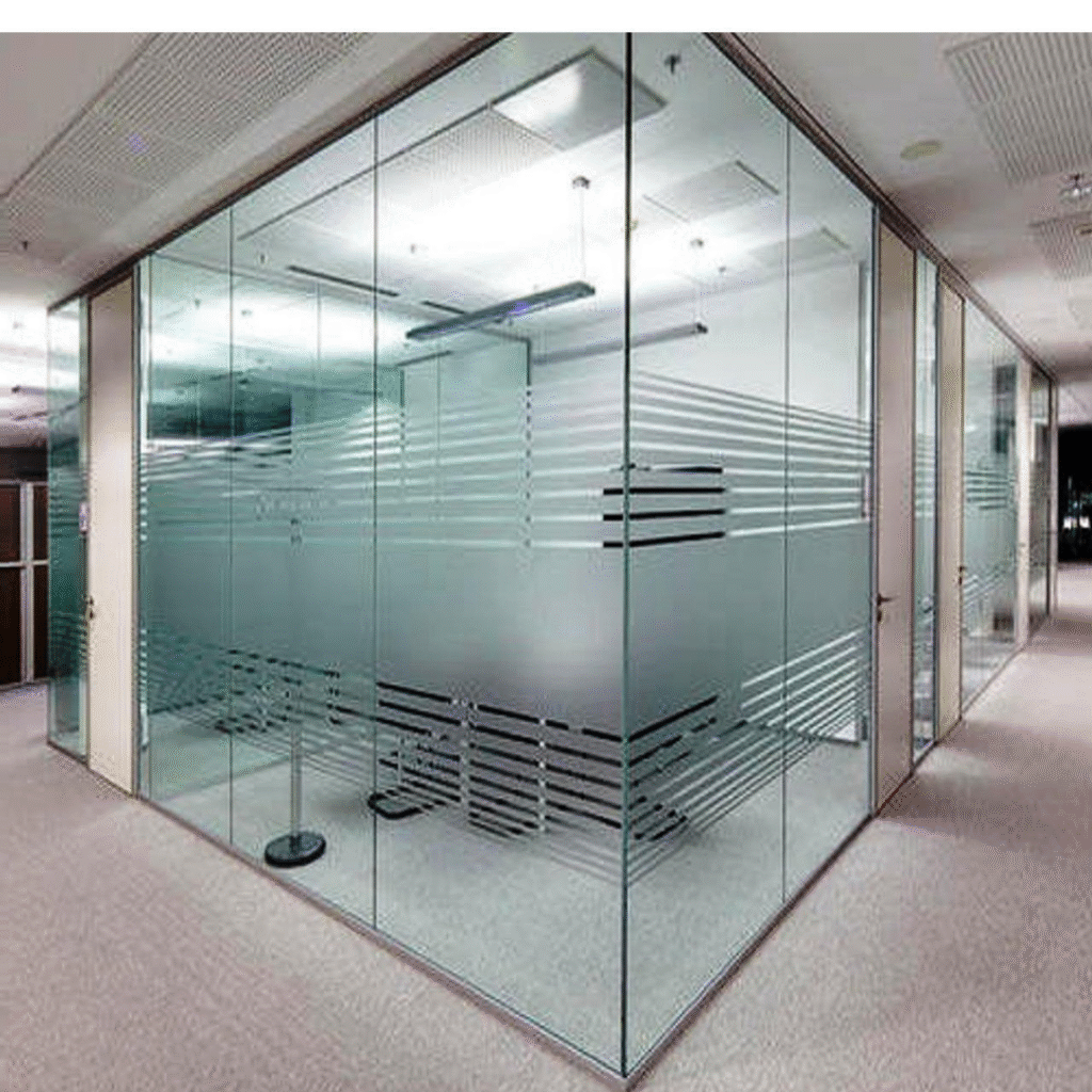 Our frameless partitions offer a clean, transparent look, ideal for open workspaces or private rooms with a modern flair. Benefits: Natural light flow, sleek appearance, acoustic insulation.