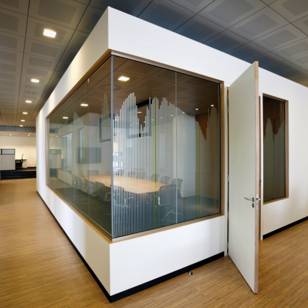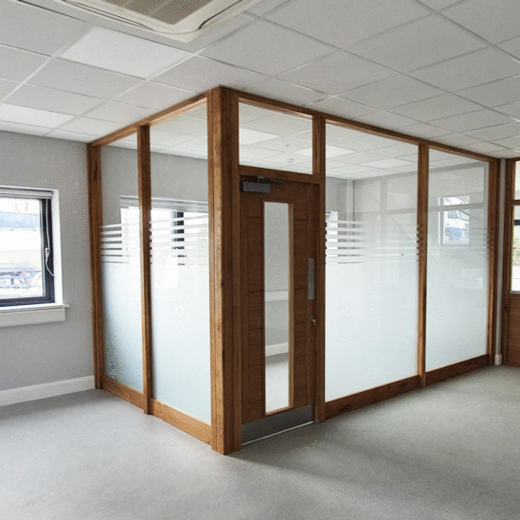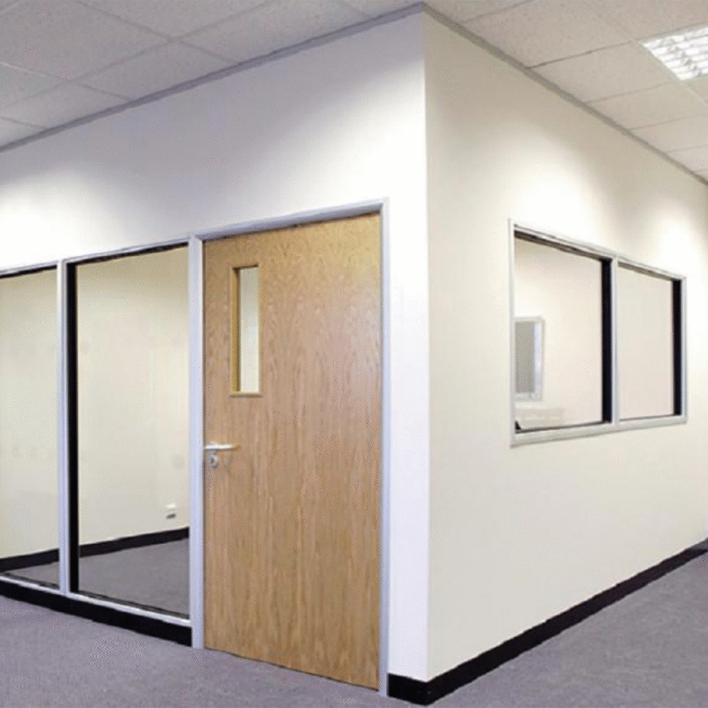 Our frameless partitions offer a clean, transparent look, ideal for open workspaces or private rooms with a modern flair. Benefits: Natural light flow, sleek appearance, acoustic insulation.